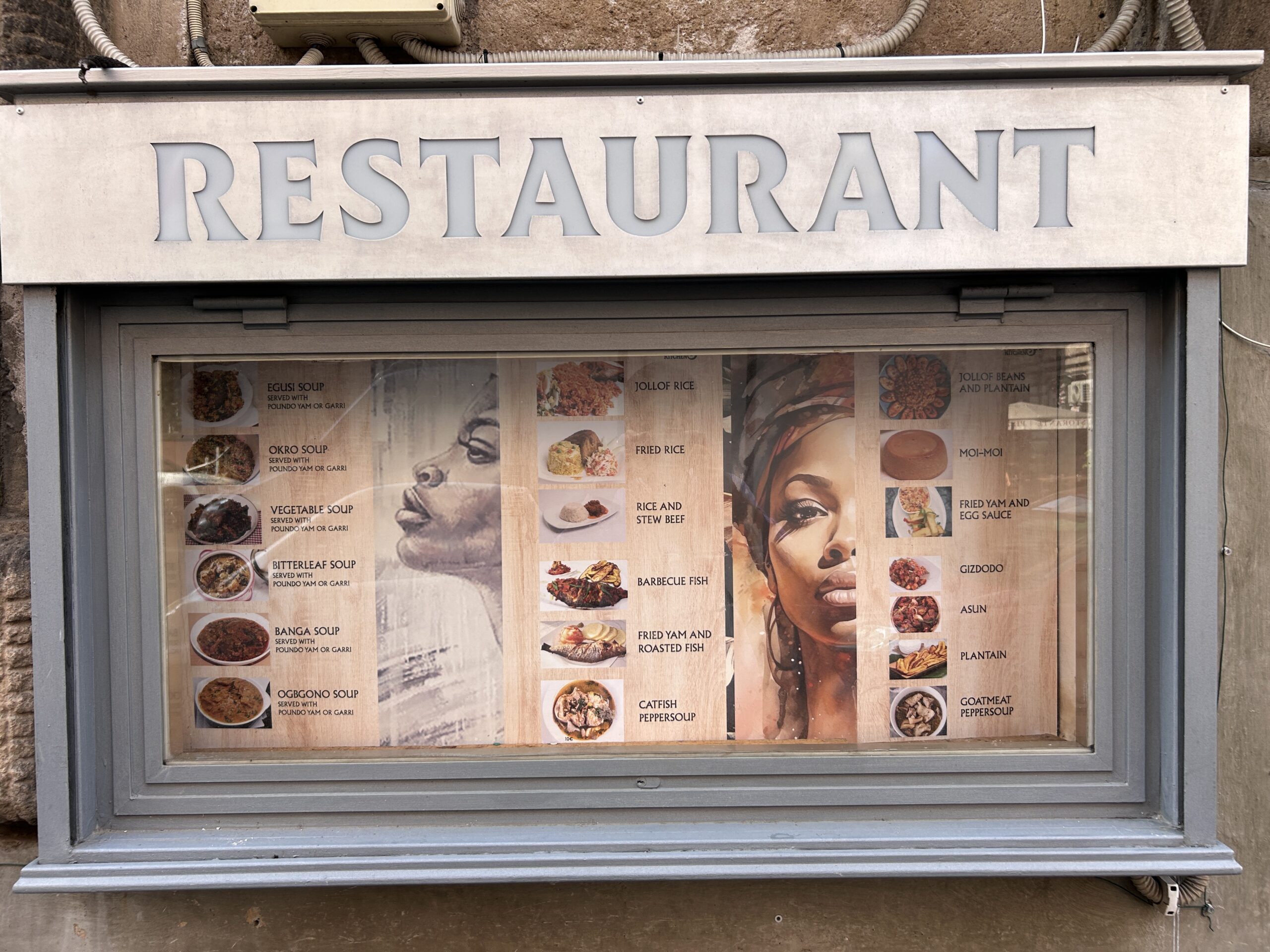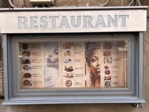 カフェやレストランの看板は、木枠やアイアンフレームに白い文字をあしらったものが多く、